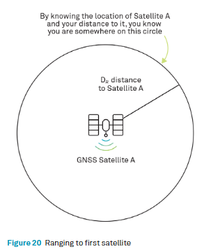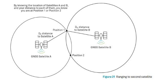 - In 2D, the receiver calculates its range to satellite A, placing it on a circle around that satellite. Adding a second satellite places the receiver at one of two intersections. A third satellite is needed to resolve the exact position.