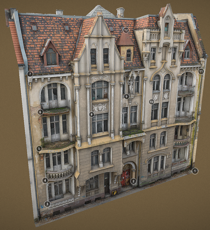 Outer contour of the building as seen from the air (in most cases, this contour corresponds to the roof); altitude corresponding to this contour (usually the height of the gutters). Only inner courtyards wider than 10 m are represented by a hole in the built-up area.