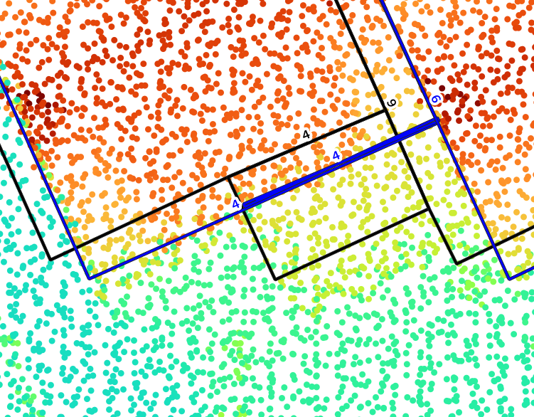 - Using the height of a point to give it more weight in fitting the roof edges seems to improve the results. However, it can also introduce issues where the edge of a neighbouring building is more likely to be selected if it is higher